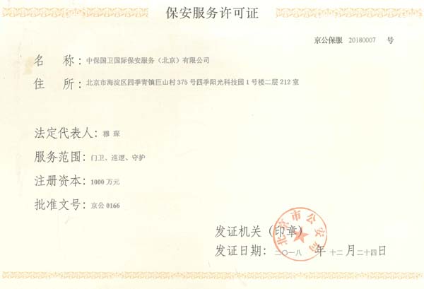 中保國(guó)衛(wèi)國(guó)際保安服務(wù)(北京)有限公司,屬中保國(guó)衛(wèi)集團(tuán)旗下子公司。能全方位的為大型客戶提供優(yōu)質(zhì)的安保、押運(yùn)服務(wù),是集人防和技防于一體的新型正規(guī)化綜合安保押運(yùn)服務(wù)企業(yè),提供人防、物防、技防、聯(lián)網(wǎng)報(bào)*、非武裝押運(yùn)等安防相關(guān)的一站式服務(wù)。